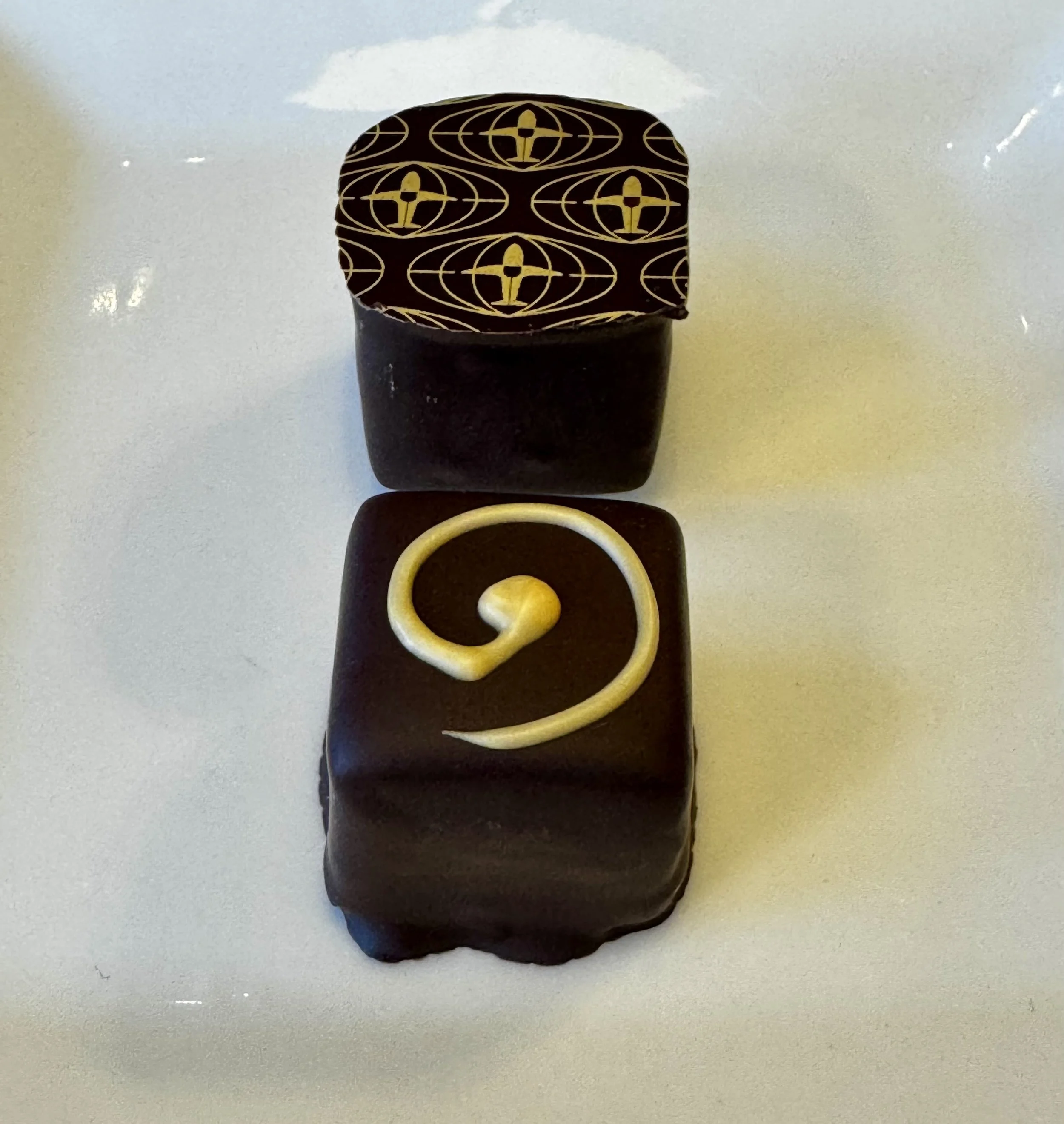 This beautiful seasonal bonbon has two layers of cheer. A white chocolate ganache, with coconut cream, peppermint, and a touch of Irish butter, sits on top of a dark chocolate, coconut cream based mocha ganache, featuring espresso beans from a local roastery.