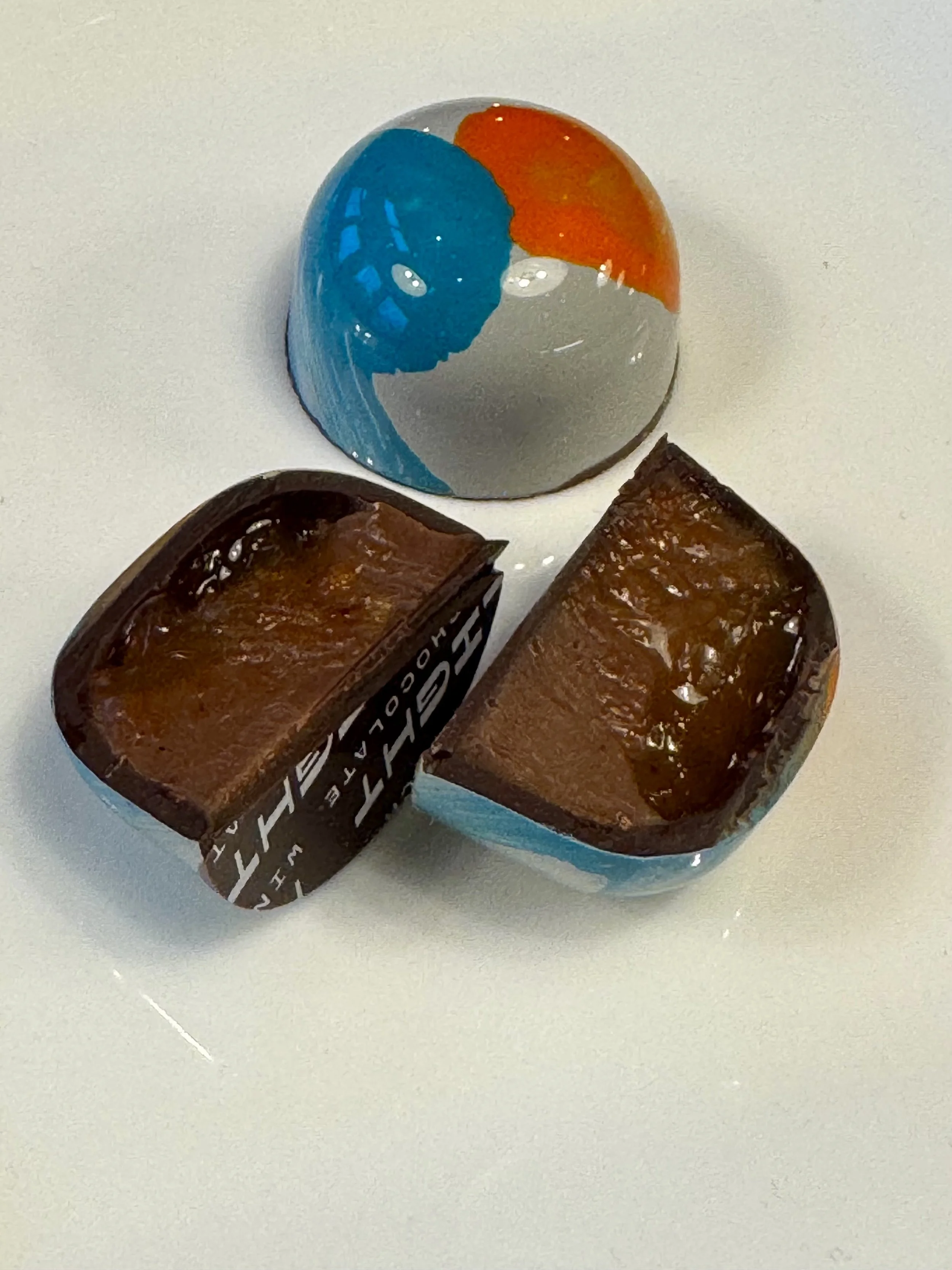 NEW! Inspired by the cocktail of the same name, this bonbon features gin spiked orange marmalade sitting on top of a caramelized milk chocolate ganache with gin, vermouth, vanilla coconut cream, Kiawe honey from Maui, and Irish butter. Creamy, rich, a bit boozy, with a bright, zesty hit of orange.